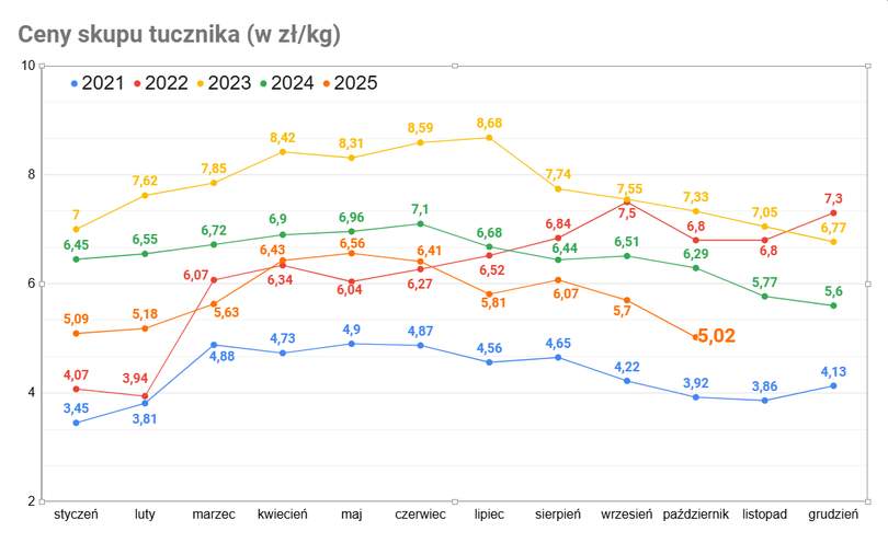 Średnia cena za październik ze wszystkich skupów wyniosła zaledwie 5,02 zł/kg. Jest ona najniższa od 4 lat. W 2022 roku, kiedy wybuchła wojna w Ukrainie, wszystkie ceny szybowały w górę. Wówczas stawki wzrosły, osiągając średnią 7,50 zł/kg. Rok i dwa później nadal notowania trzymały wysoki pułap. Raz rosły, raz spadały, jednak hodowca mógł liczyć na jakiś zarobek. Te oferty natomiast, jakie aktualnie dostają producenci za trzodę chlewną, są poniżej opłacalności. W przeciągu półtora miesiąca spadły one o 1,50 zł na kilogramie.