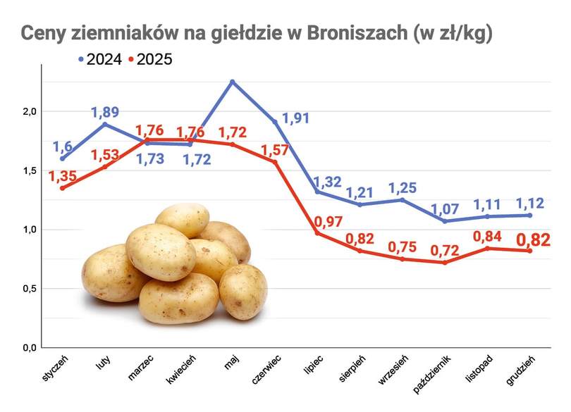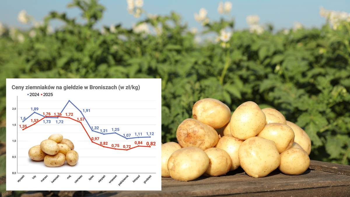GUS oszacował zbiory ziemniaka na poziomie 6,8 mln ton. Wydajność z hektara przerosła najśmielsze oczekiwania rolników. Wyniosła bowiem około 40 - 50 ton już przesortowanego, czystego surowca. Tak wysokie ilości przełożyły się na problem ze zbytem i spadkiem cen do bardzo niskich poziomów. W skupach za kilogram ziemniaków płacono jedynie około 20 groszy. Rok wcześniej rolnik mógł liczyć na 1,20 zł/kg. Na giełdach natomiast ceny ziemniaków w pierwszym kwartale rosły. Gwałtowny spadek nastąpił między czerwcem a lipcem. Średnia stawka na rynku Bronisze spadła wówczas aż o 60 groszy na kilogramie. W kolejnych miesiącach notowania leciały na łeb na szyję. Najmniej na wspomnianym rynku kosztowały w październiku, Sprzedawano je wówczas po 0,47 - 0,9 zł/kg. W listopadzie nastąpiła niewielka podwyżka do pułapu 0,50 - 1,20 zł/kg. W grudniu natomiast ceny ziemniaków w Broniszach oscylowały w granicach 0,47 - 1,10 zł/kg. Pewnym światełkiem w tunelu dla rolników są wyniki handlu zagranicznego, gdzie polski ziemniak bije rekordy popularności. Eksport tego surowca rośnie w imponującym tempie. Dla porównania w 2023 roku eksport wynosił zaledwie 7,3 tys. ton, kiedy już rok później - 26 tys. Prawdziwy przełom przyniósł jednak rok 2025 - tylko do 19 września zagraniczni odbiorcy kupili 71 tys. ton polskich ziemniaków.