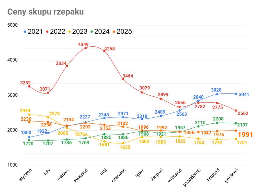 Aktualne ceny rzepaku, po poniedziałkowych korektach, wahają się między 1900 a 2070 zł/t. Analizując jednak poniższy wykres zauważyć można, że w tym roku stawki rzepaku nie były poddawane dużym korektom, tak jak widoczne jest to w ubiegłych latach. Niemniej jednak na przestrzeni ostatnich lat niższe niż obecne stawki były jedynie w 2023 roku.