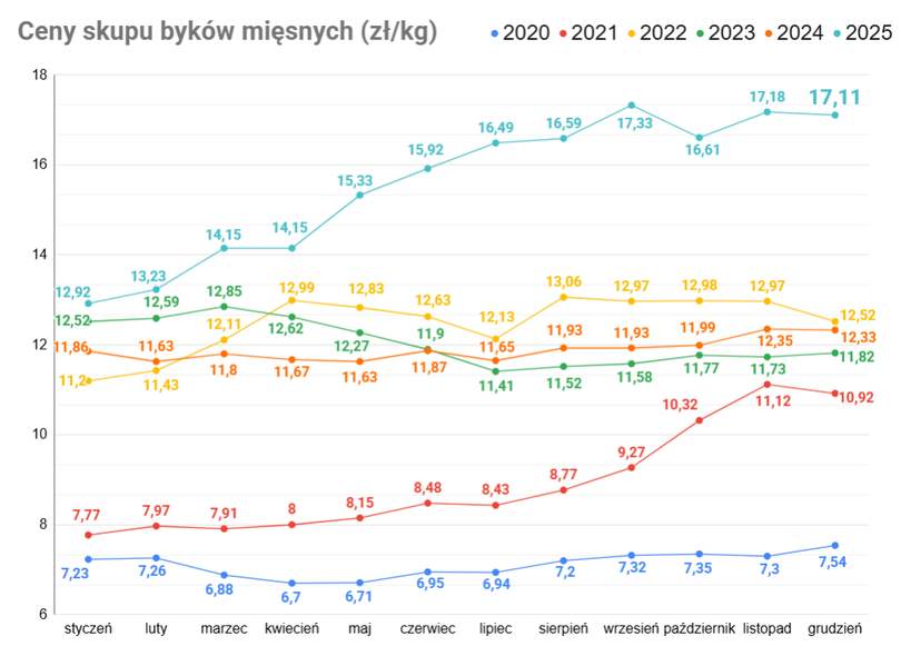Za byka mięsnego nadal można dostać 20 zł/kg, a średnia stawka w grudniu, póki co, wynosi 17,11 zł/kg. Największy spadek cen bydła widoczny był w październiku. Notowania obniżane były wówczas nawet o złotówkę na kilogramie, a w niektórych skupach nawet powyżej. Średnie ceny z tego okresu, widoczne na wykresie, obrazują załamanie koniunktury. Później ceny nieco odbiły. Lekkie korekty pośrednicy nanosili też wraz z początkiem grudnia. Trudno jednoznacznie wyjaśnić, czym spowodowane są wahania na rynku bydła.
