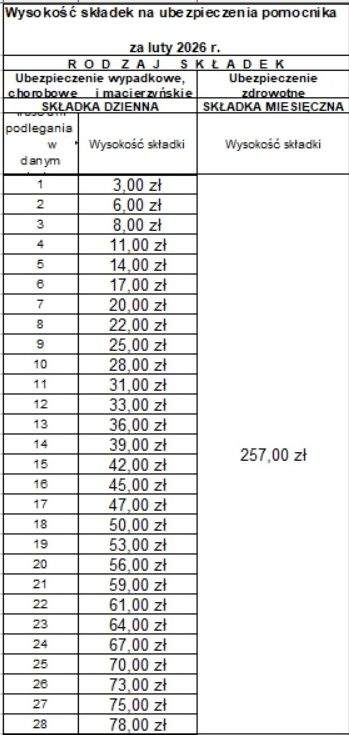 Przypomnijmy: w przypadku ubezpieczenia zdrowotnego zasada jest prosta i niezmienna: płacimy ryczałt. Niezależnie od tego, czy pomocnik przepracuje u nas tydzień, czy cały miesiąc, składka miesięczna wynosi w lutym 257 zł.