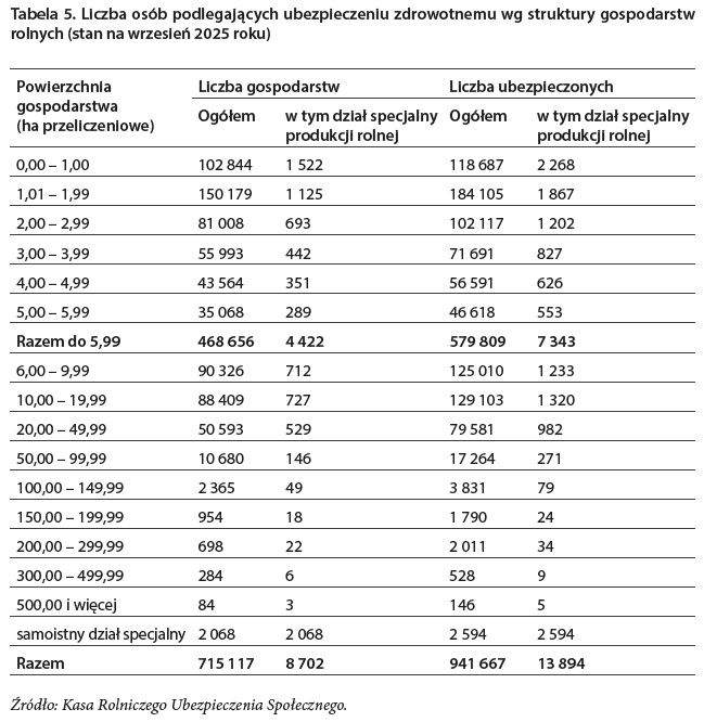 Najnowsze dane, zawarte w czasopiśmie KRUS pt. "Ubezpieczenia w Rolnictwie – Materiały i Studia" obrazują niezwykle ciekawe dane. W rozdziale o ubezpieczeniach i składkach zdrowotnych rolników, napisanym przez Dorotę Faryn i Honoratę Ziembińską, możemy sprawdzić m.in., jaki jest podział osób podlegających ubezpieczeniu zdrowotnemu wg struktury gospodarstw rolnych (stan na wrzesień 2025 roku).
