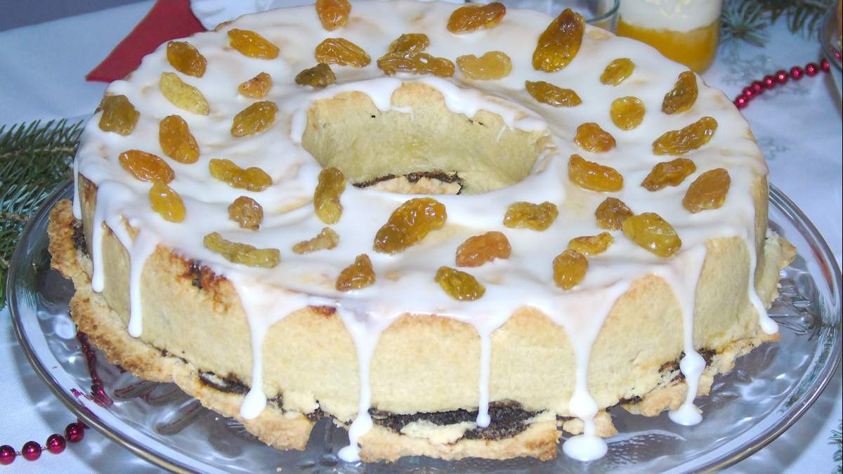 Składniki na ciasto zagniatam na jednolitą masę. Schładzam. W tym czasie ubijam białka na pianę i delikatnie mieszam z masą makową. Na blasze lub tortownicy (ja wybieram silikonową wersję okrągłej formy w dziurą w środku) wysmarowanej tłuszczem rozkładam 2/3 ciasta. Wylewam na to masę makową i posypuję bakaliami. Na nią ścieram przez tarkę resztę ciasta lub je kruszę i nakładam na wierzch. Piekę około 45 minut, aż ciasto ładnie się zrumieni. Lekko przestudzone wyjmuję z formy i polewam lukrem (cukier puder rozpuszczony w gorącej śmietance) i dekoruję bakaliami.