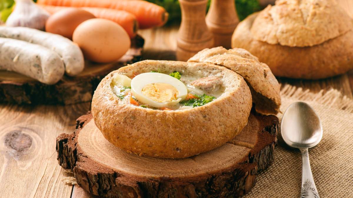 Przygotowuję zakwas na żur: w kamionkowym naczyniu lub szklanym słoju zalewam wrzątkiem 2 szklanki mąki, tak aby powstało rzadkie ciasto. Gdy ostygnie dodaję 1 litr przegotowanej letniej wody, skórkę razowego chleba i roztarty czosnek. Przykrywam gazą, odstawiam na trzy dni w ciepłe miejsce. Do przygotowania tradycyjnych żurków można też użyć gotowych już zakwasów w butelkach dostępnych w większości sklepów spożywczych. Grzyby zalewam zimną wodą i odstawiam na co najmniej godzinę. Kiełbasę, boczek i cebulę kroję w kostkę. Razem z masłem i roztartym czosnkiem podsmażam. Dodaję namoczone grzyby razem z wodą oraz wywar. Wlewam zakwas i razem z majerankiem i przyprawami chwilę gotuję. Mąkę mieszam z wodą i zaciągam żurek. Doprawiam do smaku. Można dodać śmietanę i posiekaną pietruszkę. Podaję z ugotowanym na twardo jajkiem. Najładniej prezentuje się w małym bochenku chleba.