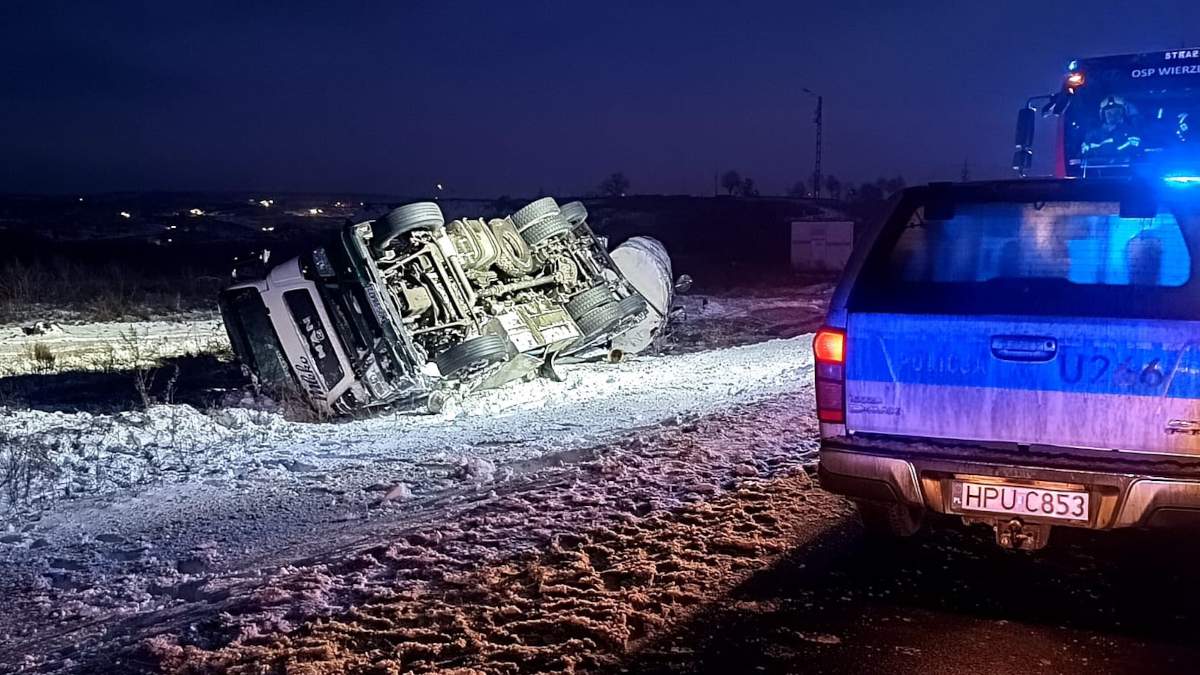 „45-letni mężczyzna kierujący zestawem pojazdów podczas jazdy złapał pobocze, w wyniku czego stracił panowanie nad pojazdem. Następnie doszło do wywrócenia się zestawu, który wpadł do rowu” - informuje KPP w Koninie.
