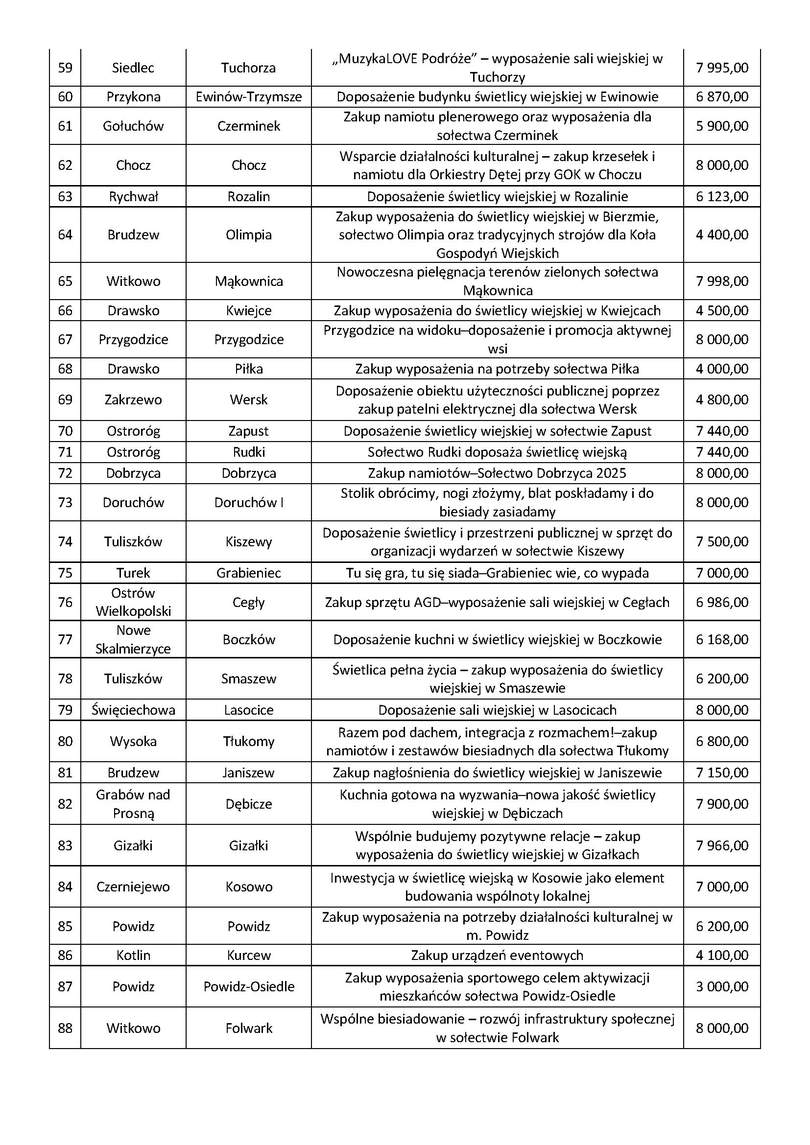Wsparcie w ramach konkursu umożliwia pozyskanie lokalnym społecznościom dodatkowych środków na realizację projektów wspierających ich aktywność oraz możliwości organizacji rozmaitych przedsięwzięć poprzez zakup wyposażenia obiektów użyteczności publicznej, zakup towarów służących kultywowaniu tradycji społeczności lokalnej i tradycyjnych zawodów oraz materiałów promujących sołectwo.