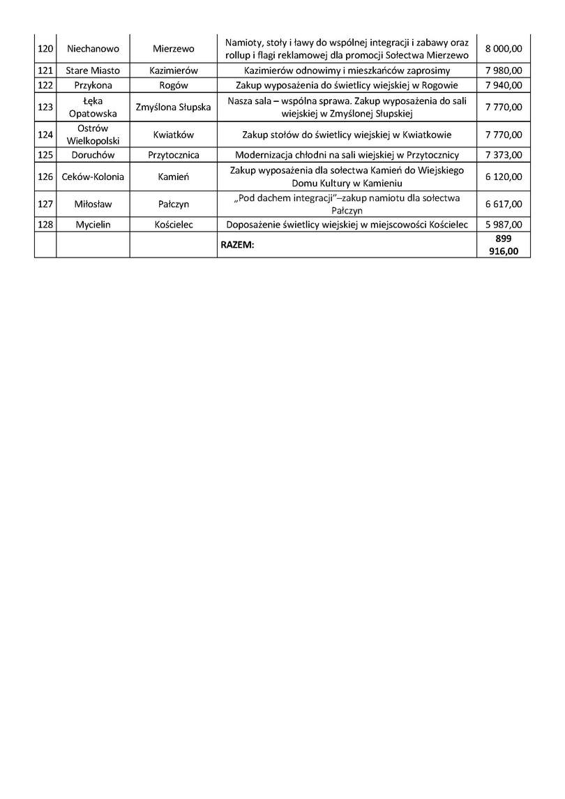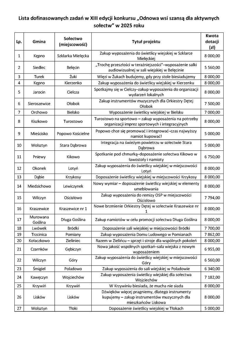 Już po raz trzynasty do wielkopolskich sołectw trafi wsparcie na realizację zadań wspierających aktywne społeczności lokalne. Konkurs „Odnowa wsi szansą dla aktywnych sołectw” umożliwi 128 sołectwom z całego województwa zrealizować pomysły na rozwój swojej miejscowości. Prawie 900 tys. złotych z budżetu Województwa Wielkopolskiego zostanie wykorzystane na realizację kolejnych projektów z udziałem mieszkańców wielu miejscowości. Program Wielkopolska Odnowa Wsi to przede wszystkim aktywność samych mieszkańców, którzy mają wpływ na to co chcą zrealizować w swoich „małych ojczyznach”. Cieszy zainteresowanie programem i konkursami ze strony sołectw i samorządów lokalnych, ponieważ z roku na rok liczba zgłoszeń rośnie – mówi Wicemarszałek Województwa Wielkopolskiego Krzysztof Grabowski