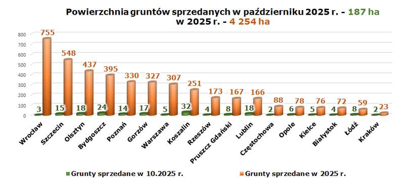 W okresie od początku stycznia do końca października 2025 r. w całym kraju odbyło się prawie 3,8 tys. przetargów na dzierżawę. Najwięcej przeprowadziły Oddziały Terenowe we Wrocławiu – 758, Lublinie – 345 i Opolu – 338.