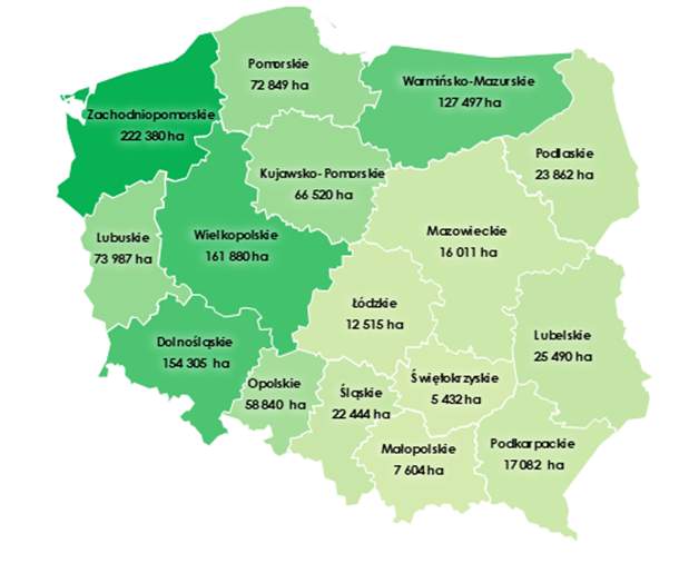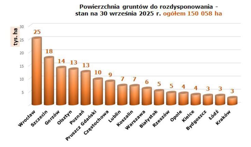 Zdecydowanie powszechniejszą formą rozdysponowania gruntów państwowych jest dzierżawa. I tutaj KOWR przedstawia następujące dane: według stanu na koniec września 2025 r. w dzierżawie pozostawało prawie 1,069 mln ha. Największe powierzchnie wydzierżawionych gruntów znajdują się w województwach: zachodniopomorskim – 222 tys. ha; wielkopolskim – 161 tys. ha; dolnośląskim – 154 tys. ha i warmińsko-mazurskim – 127 tys. ha.