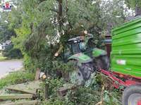 Kierujący ciągnikiem rolniczym z dwoma przyczepami wjechał w drewniany dom mieszkalny. Policjanci ustalają okoliczności zdarzenia.