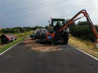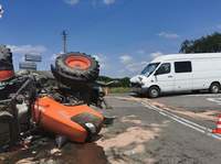 Kierowca traktora trafił do szpitala. Według wstępnych informacji, winę za zderzenie ponosi obywatel Ukrainy kierujący samochodem dostawczym.