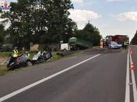 Pasażer osobówki nie przeżył zderzenia z ciągnikiem z przyczepą.