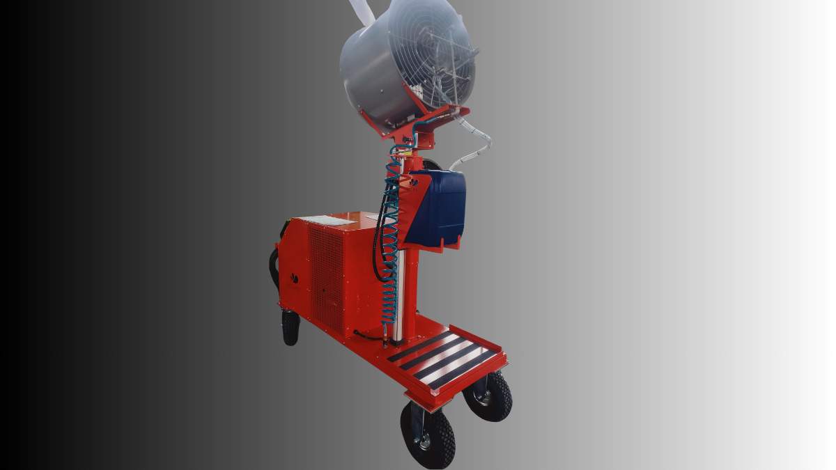 Kluczowym atutem jest jednak podnoszona turbina. Wysokość urządzenia można regulować w zakresie od 175 do 230 cm. Pozwala to na wykonanie zabiegu ponad wierzchołkami niższych roślin lub dostosowanie strumienia mgły do wysokości składowania skrzyń w chłodni.